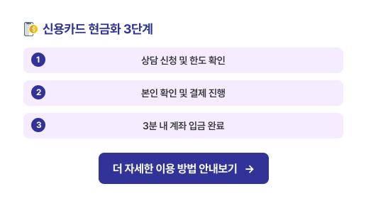 복잡한 절차 없이 3분 안에 신속하게 현금을 마련하세요. 전 카드사 지원, 높은 지급률 보장!